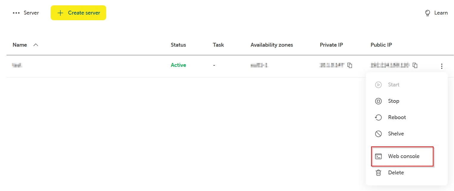 Section titled “Via web console”Once your server is available, you can navigate to its menu options (three vertical dots on the right) in the STACKIT Portal and choose the Web console to view its status (during reboot for example).