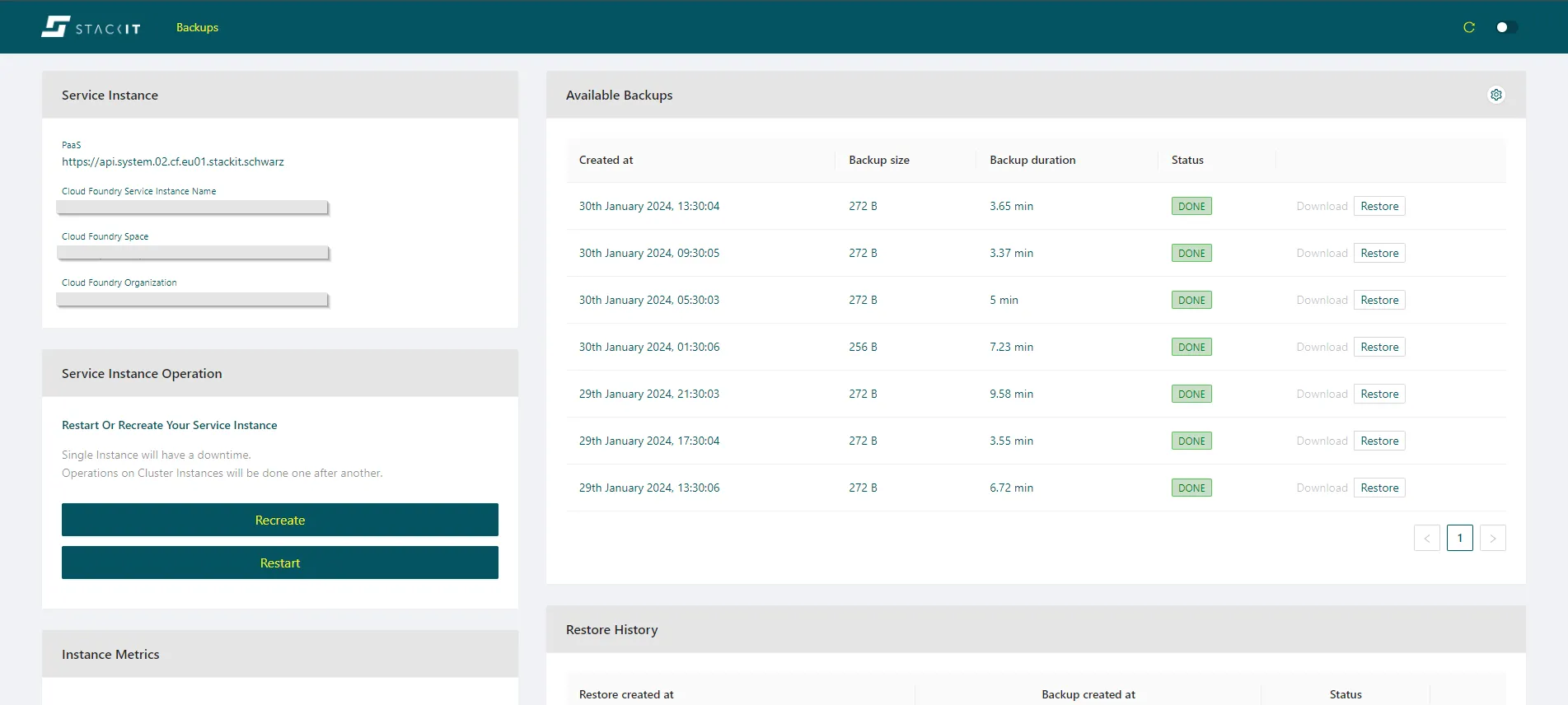 Terminal window name: my-cf-opensearch-serviceguid: cd8c...type: managedbroker: a9s-searchoffering: appcloud-opensearch2plan: opensearch-1.4.10-singletags:offering tags: searchenginedescription: OpenSearch is a fully managed search and analytics engine.documentation:dashboard url: https://a9s-search-dashboard.system.01.cf.eu01.stackit.cloud/service-instances/cd8c...Showing status of last operation:status: create succeededmessage:started: 2025-11-20T08:19:34Zupdated: 2025-11-20T08:19:34ZShowing bound apps:There are no bound apps for this service instance.Showing sharing info:This service instance is not currently being shared.Showing upgrade status:Upgrades are not supported by this broker.In the Overview tab all informations about the selected service instance are displayed.