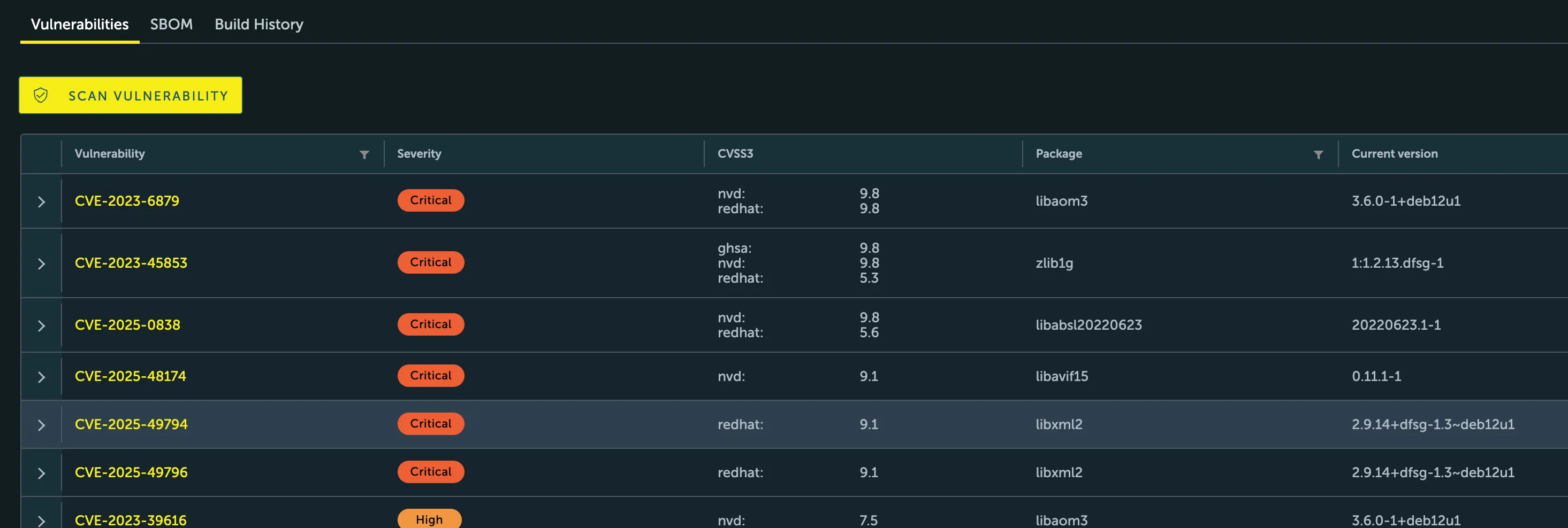 Section titled “Interpreting the vulnerability report”Once a scan is complete, the results are displayed in the Vulnerabilities column. Click on the artifact’s digest to view the detailed report, which provides the following information for each discovered vulnerability: