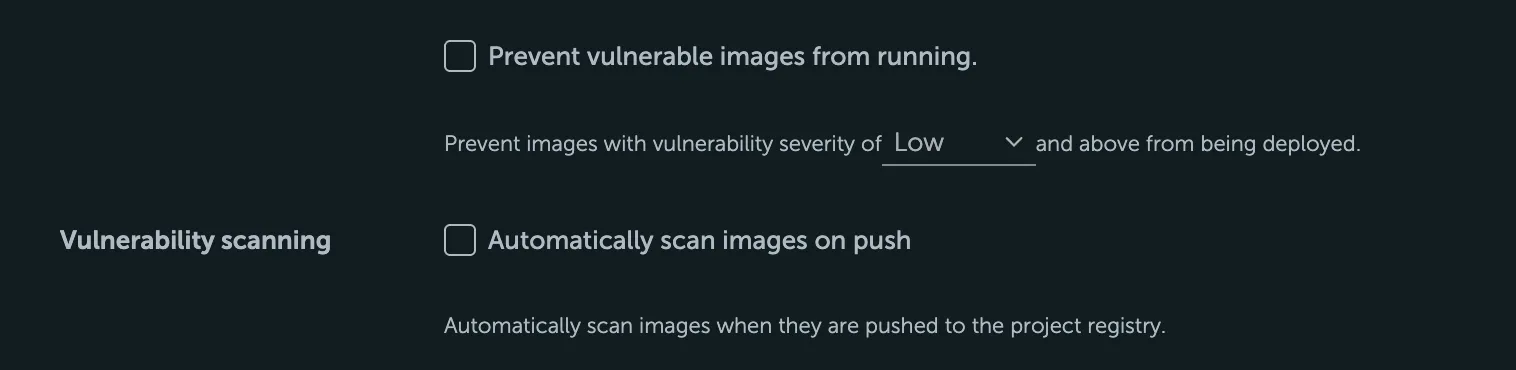 Section titled “Configuring project-level scan policies”Project Admins can configure policies within a project to ensure that images are scanned consistently and that vulnerable images are prevented from being used.