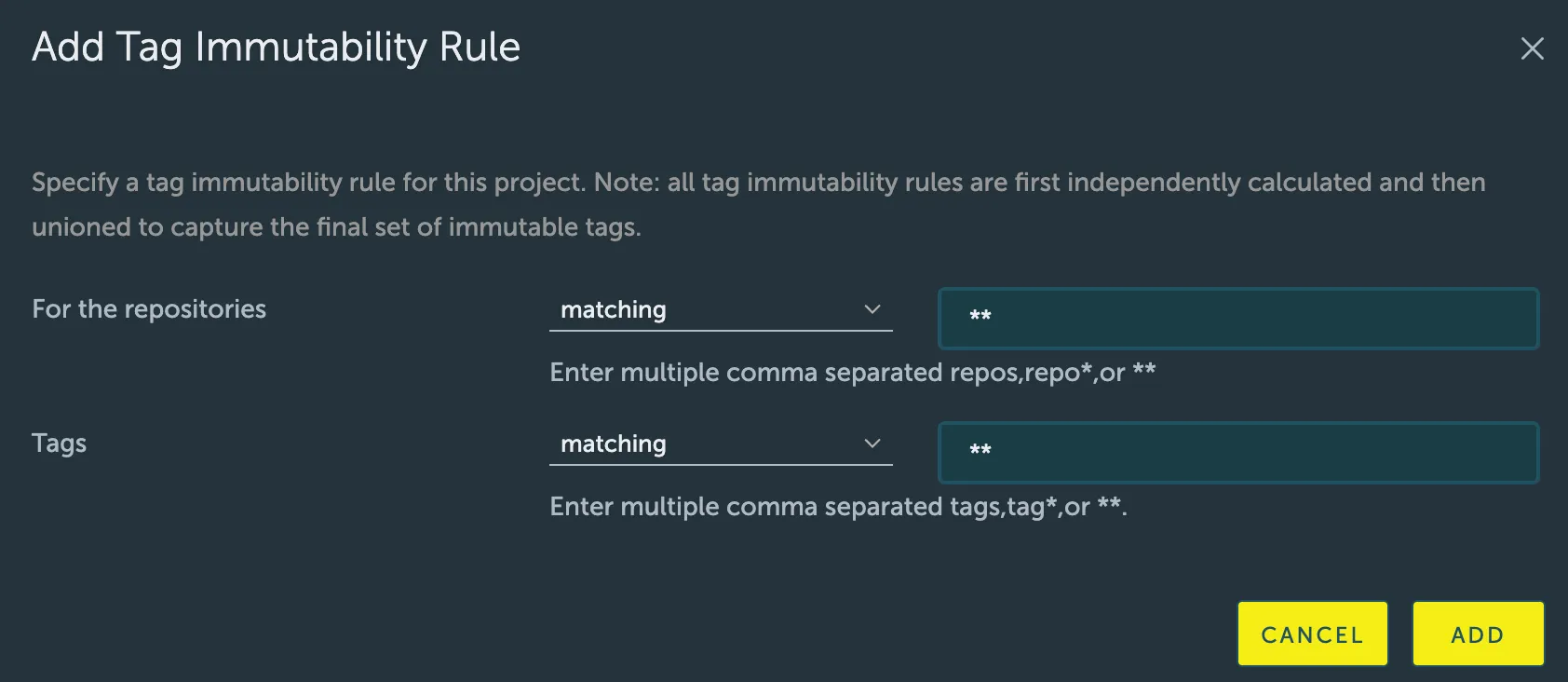 Section titled “How immutability rules work”Tag immutability allows administrators to define policies at the project level that prevent specific tags from being overwritten. When an immutability rule is in effect, any attempt to push an image with a tag that already exists and matches the rule will be rejected by the registry. This guarantees that a tag, once applied, will always point to that same image digest.