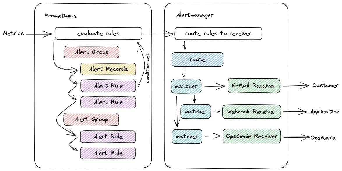 - Prometheus periodically checks all defined Alert Rules to see if their condition is met in the expression (