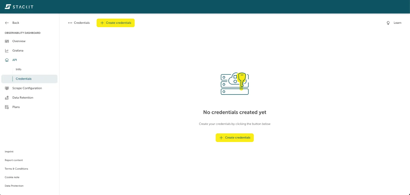 - In the Observability Service Dashboard, open the API tab and select the Credentials section.