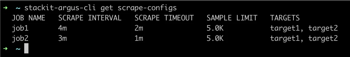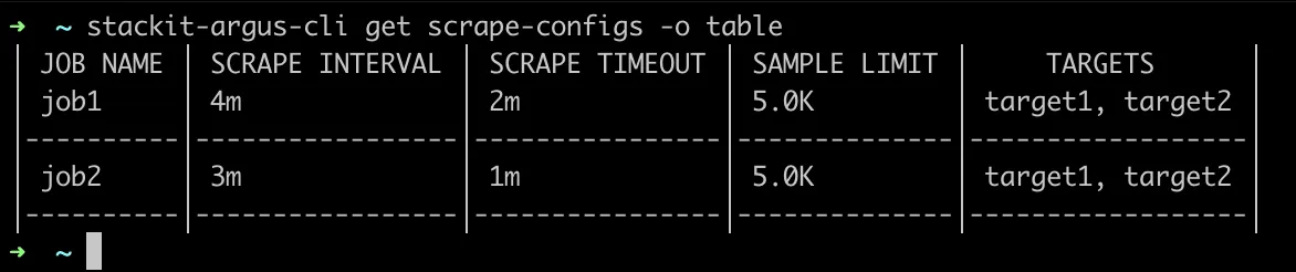 stackit-observability-cli get scrape-configs -o wide-tableStructured Output (-o json | -o yaml)