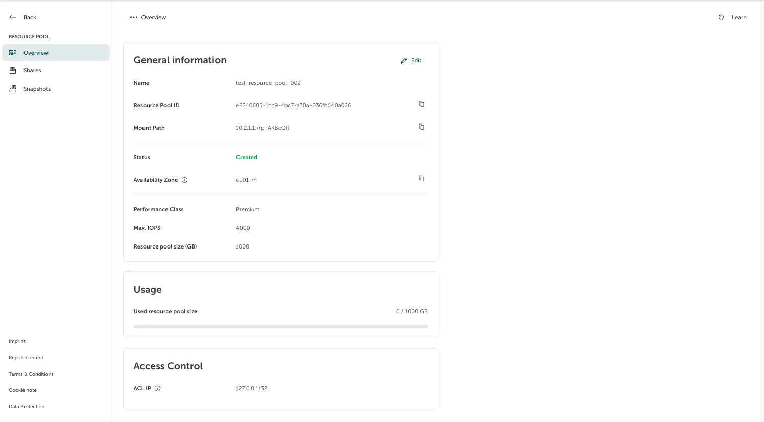 To create an NFS Share on a Resource Pool, click on the Resource Pool in the list that you want to create the NFS Share on. In our case, we will use “test_resource_pool_002”.