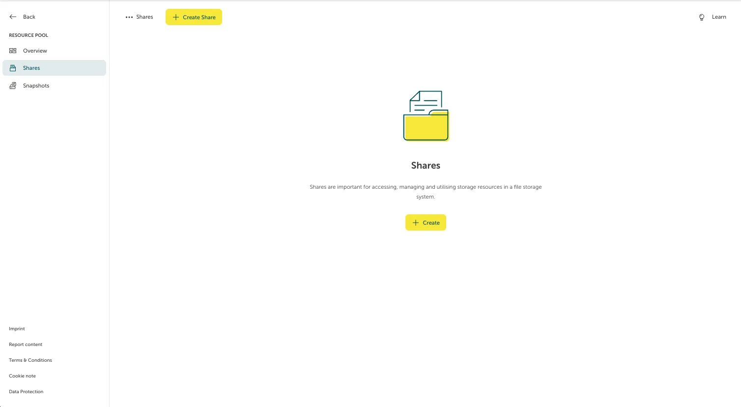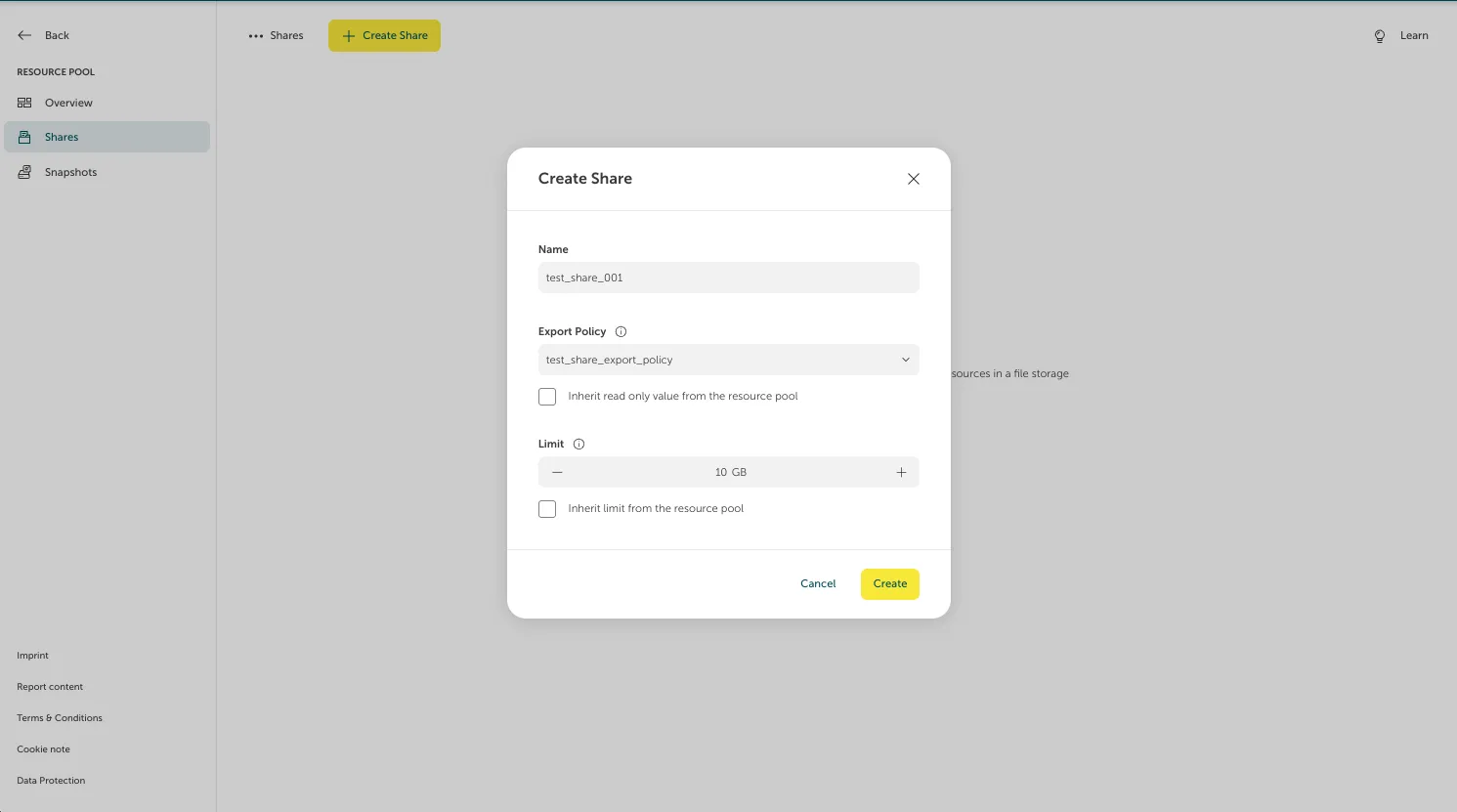 A form will pop up where we can fill in the required data. After doing so, hitting “Create” will create the requested NFS Share.