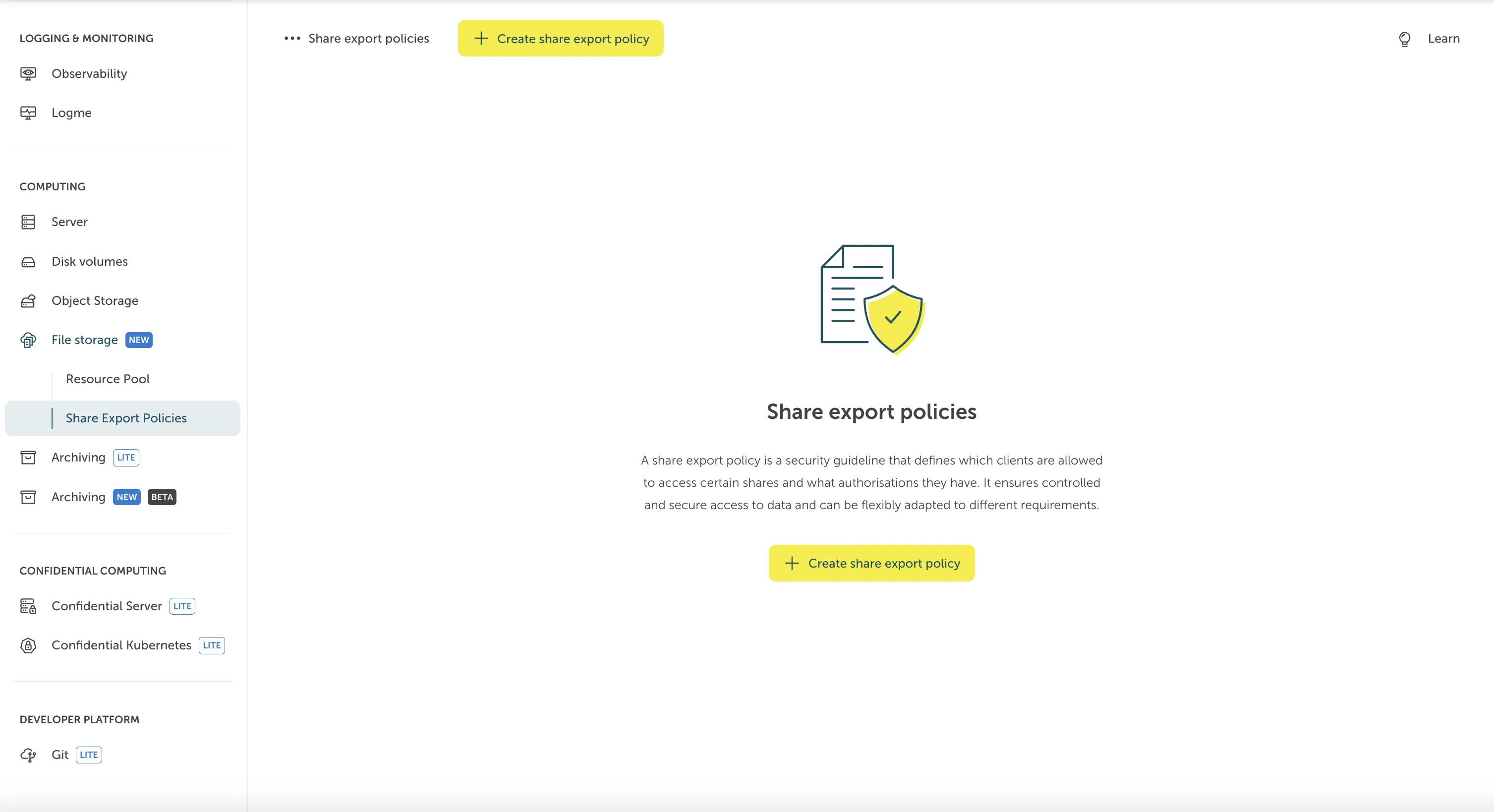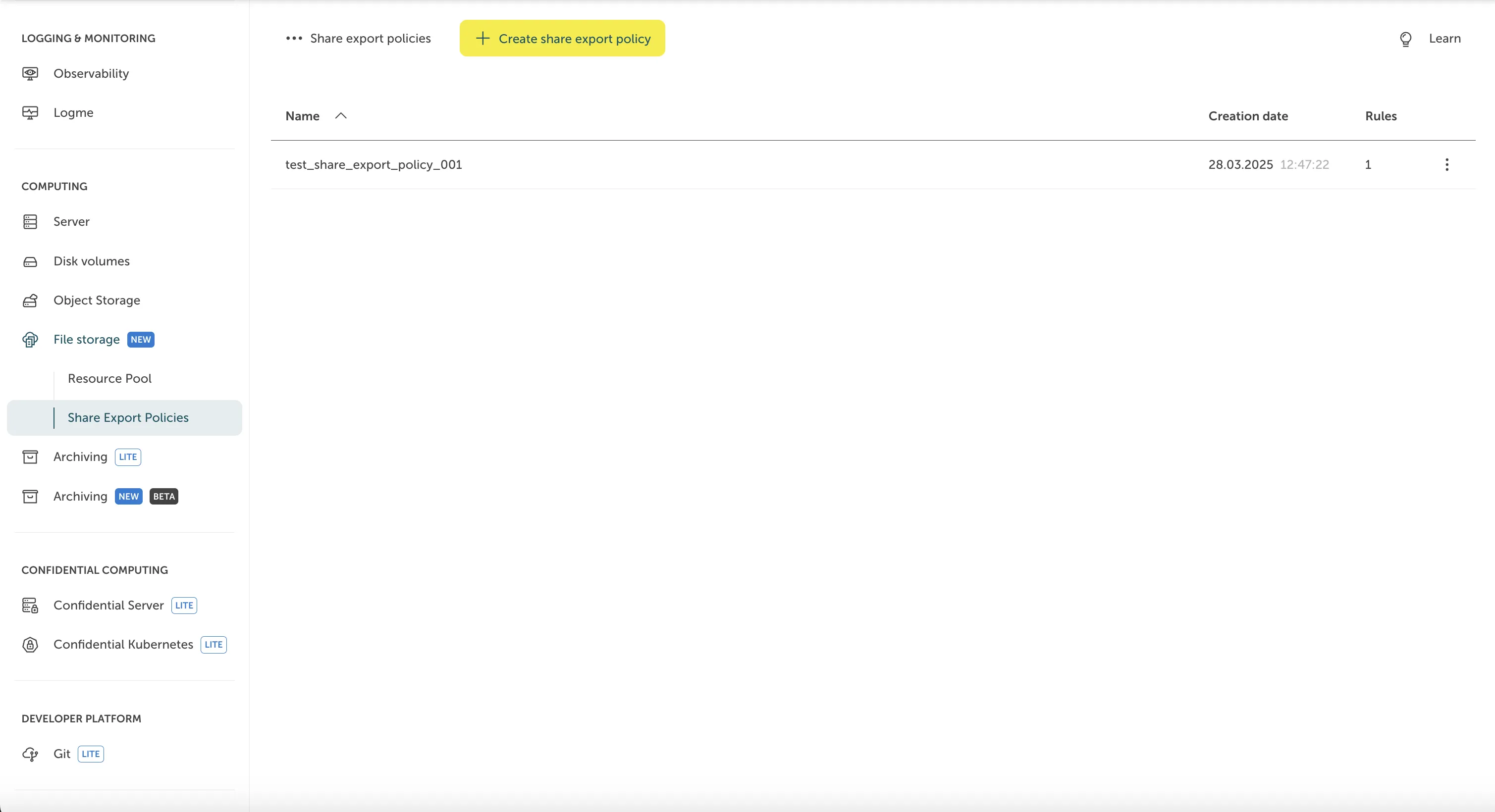 To create a Share Export Policy, go to “File Storage > Share Export Policies” and click on “Create Share Export Policy”.