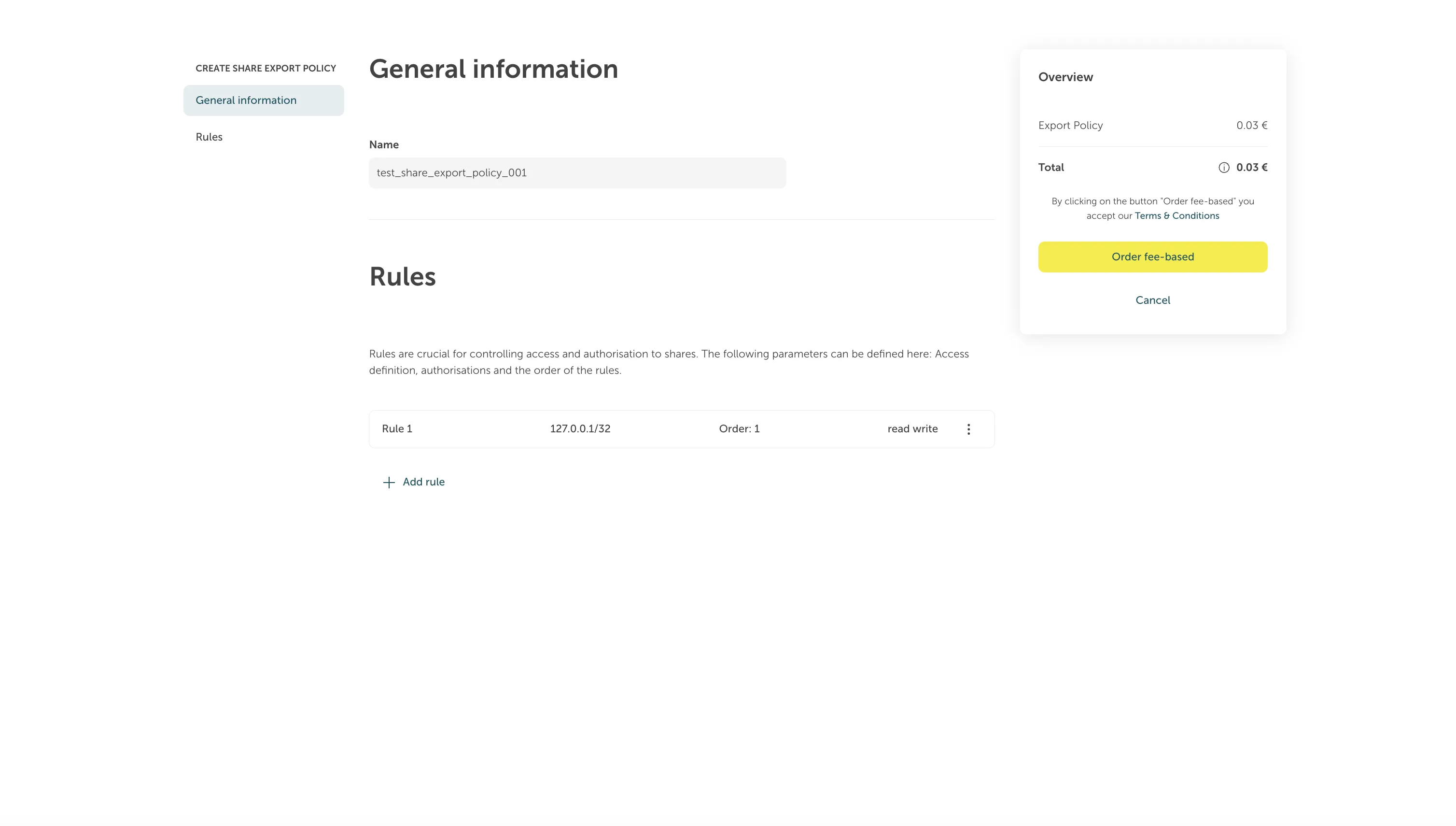 You will be prompted to a form where you can fill in the details for the Share Export Policy. After doing so, you can click “Order fee-based” to finish the process.