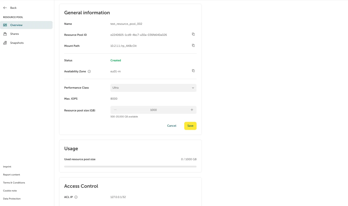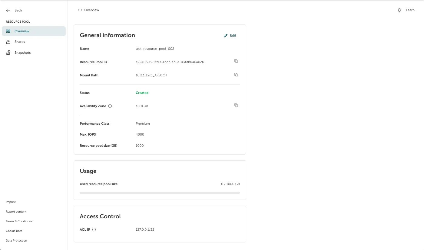 To alter an existing Resource Pool, go to “File Storage > Resource Pools”. Click on the respective Resource Pool in the list, in this case “test_resource_pool_002”.